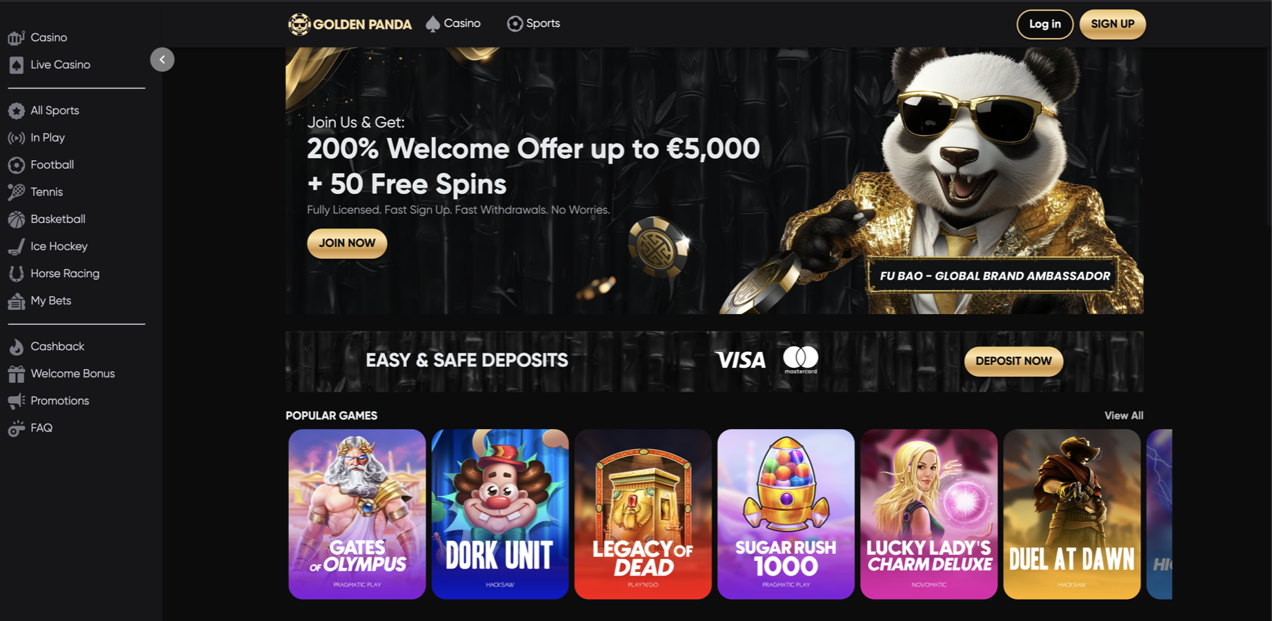 | Golden Panda | 200% up to €5,000 + 50 free spins | 3,000+ (slots, Table Games, Live Dealers, Sportsbook) | Credit cards, crypto wallets, e-wallets | Localized support and balanced game variety |