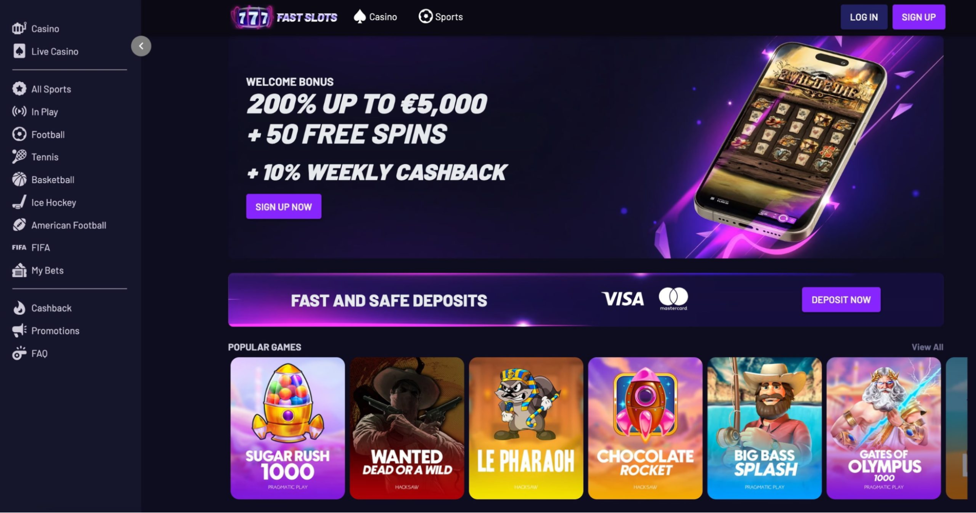 | Fast Slots | 200% up to €5,000 + 50 free spins | 4,000+ (slots, Bingo, Sports Betting) | Cards, crypto, digital wallets | Speedy gaming and instant withdrawals |